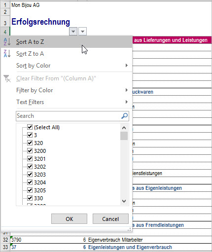 Spalten filtern Die Filterfunktion erreichen Sie via der Dropdown Funktion in den entsprechenden Spalten. Im vorliegenden Beispiel haben Sie die Möglichkeit individuelle Bereiche auf Konto oder Gruppenebene zu filtern.