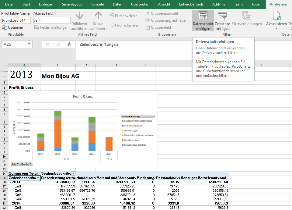 1. Der Zeiger muss auf eine PivotTable Zelle aktiv sein, um den Register "Analysieren" vor sich zu haben.