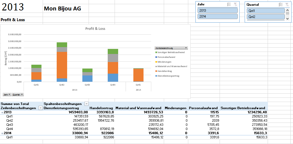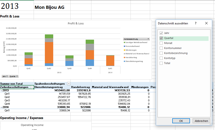 Datenschnitte sind Filtersteuerelemente, die mit einem Mausklick bedient werden und mit denen der in PivotTables und PivotCharts angezeigte Teil des Datasets eingeschränkt werden kann. Datenschnitte können sowohl in Microsoft Excel-Arbeitsmappen als auch in PowerPivot-Arbeitsmappen verwendet werden, um Daten interaktiv zu filtern und zu analysieren.