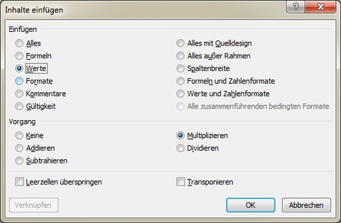 Schalten Sie die Optionen WERTE und MULTIPLIZIEREN ein.