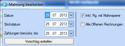 Wenn Sie den Button Vorschlag erstellen betätigen, werden alle Rechnungen, die zum Stichdatum überfällig sind, in den Mahnvorschlag geladen.