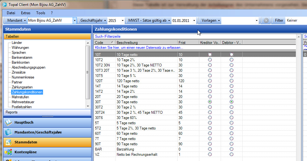 In dieser Tabelle definieren Sie die Zahlungskonditionen. Damit Topal eine fällige Kunden- oder Lieferantenrechnung in einem Debitoren- oder Kreditoren - Zahlungslauf rechtzeitig zur Zahlung
