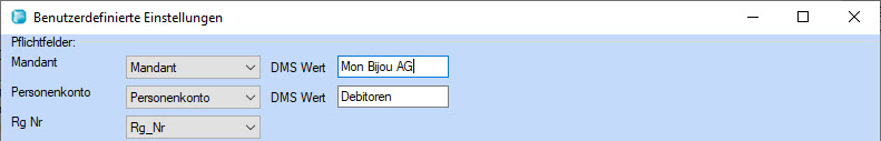 Das Pflichtfeld Personenkonto beinhaltet einen fixen String "Debitor". Wird in Ihrem DMS System ein anderer Term verwendet, können Sie diesen im Feld DMS Wert hinterlegen.