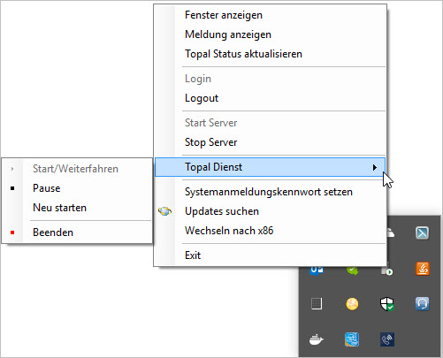 Soll der Topal Server Dienst gestoppt oder gestartet werden, kann dies via Kontextmenu auf dem entsprechenden Topal Server Icon erreicht werden.