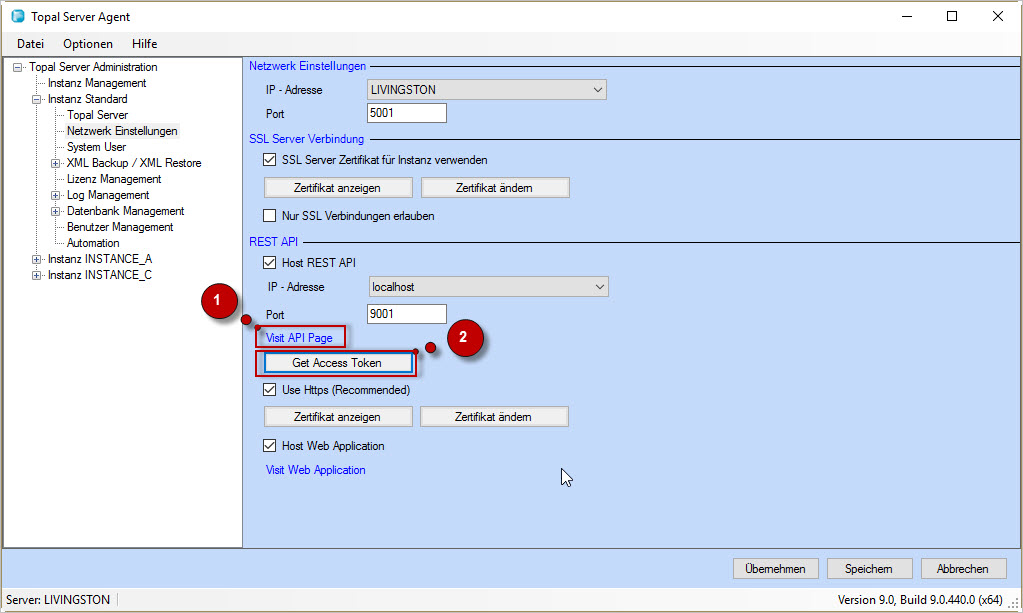 Die Beschreibung der REST API Funktionen sind via [Topal Server Agent | Netzwerk Einstellungen] zu öffnen. Folgen Sie den unten beschriebenen Schritten um den interaktiven