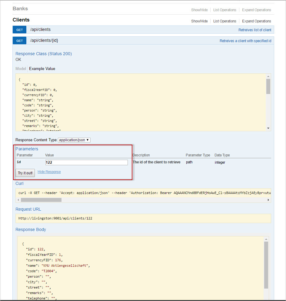 Wählen Sie nun zum Beispiel Clients an und füllen Sie die erforderlichen Felder aus. Drücken Sie dann [Try it out]. Die gewünschten Informationen werden gelesen und