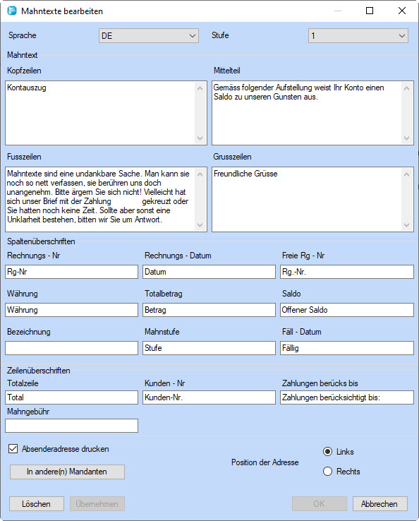Mahnstufe und Sprache aus und erfassen dann in den dafür vorgesehenen Feldern Kopfzeile, Haupttext der Mahnung, Fusszeile und Grussformel. Ausserdem