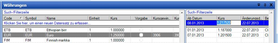Werden Tageskurse verwendet, wird hier das Datum definiert, ab welchem der Kurs gültig ist. Der Kurs wird solange verwendet, bis ein neuer Kurs mit einem höheren gültig ab Datum erstellt wird, auch Geschäftsjahres-übergreifend.