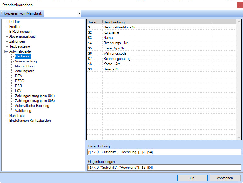 Automatiktexte erlaubt Ihnen zusammenhängende Buchungstexte zu generieren. Diese können sich z.B. aus Rechnungsnummer und Kurzname des Debitors/Kreditors
