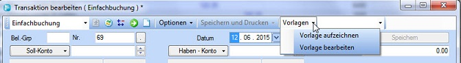 1. Öffnen Sie das Fenster Transaktion bearbeiten im Modus Sammelbuchung und wählen Sie aus dem Menü Vorlagen den Befehl Vorlage aufzeichnen.