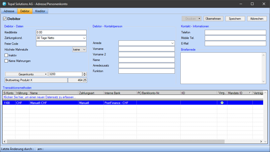 Der Dialog ist grundlegend in 4 Bereiche Debitor Daten, Debitor - Kontaktperson, Kontakt Informationen und Transaktionsmethoden aufgeteilt. Die meisten Felder in diesem Register sind selbsterklärend.