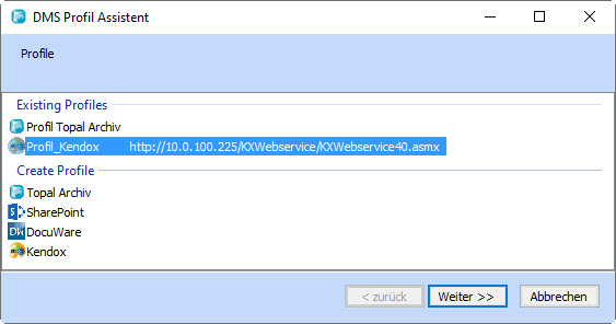 2) DMS Profil wählen - Selektieren Sie das gewünschte DMS Profil [Profil Kendox] (siehe Abbildung 1)