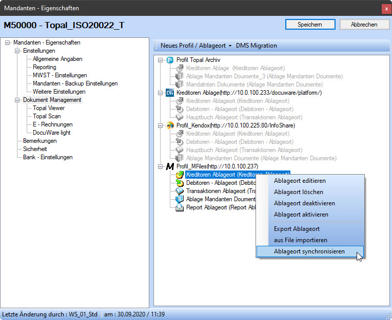 die in Zusammenhang mit der Anbindung Ihres DMS Systems und Profilen die der Ablage (Speicherort) dienen. Entsprechend stehen unterschiedliche Kontextmenüs