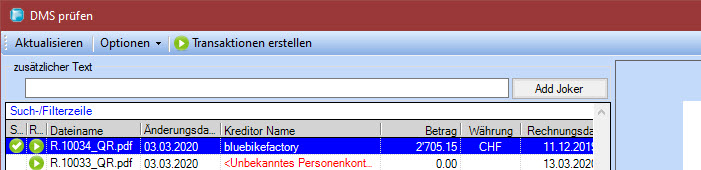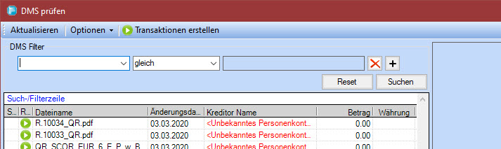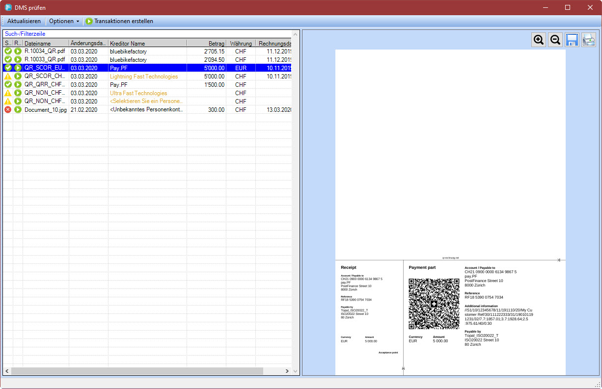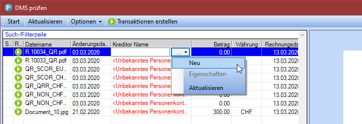 DMS gelesen und in den Transaktions Dialog übernommen. Bei der Erkennung kann es sein, dass die Adresse des Kreditor's der