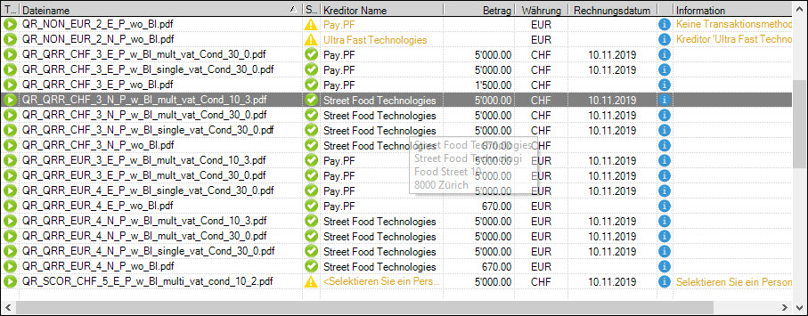 mit einer fehlenden Information "gelb" ausgewiesen werden. Rechnungen die weder über eine Referenzzeile noch einen QR Code verfügen, werden mit einem "Error" Icon im