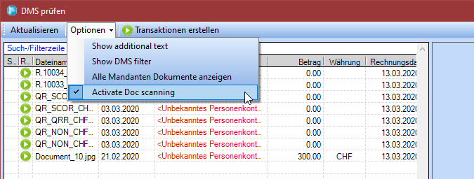 Via [Transaktionen erstellen] Knopf starten Sie einen Batchprozess der aus allen gescannten Dokumenten nacheinander „Transaktionen erstellt“.