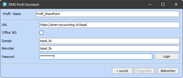Verbindungsparameter Einstellungen für SharePoint DMS Anbindung.