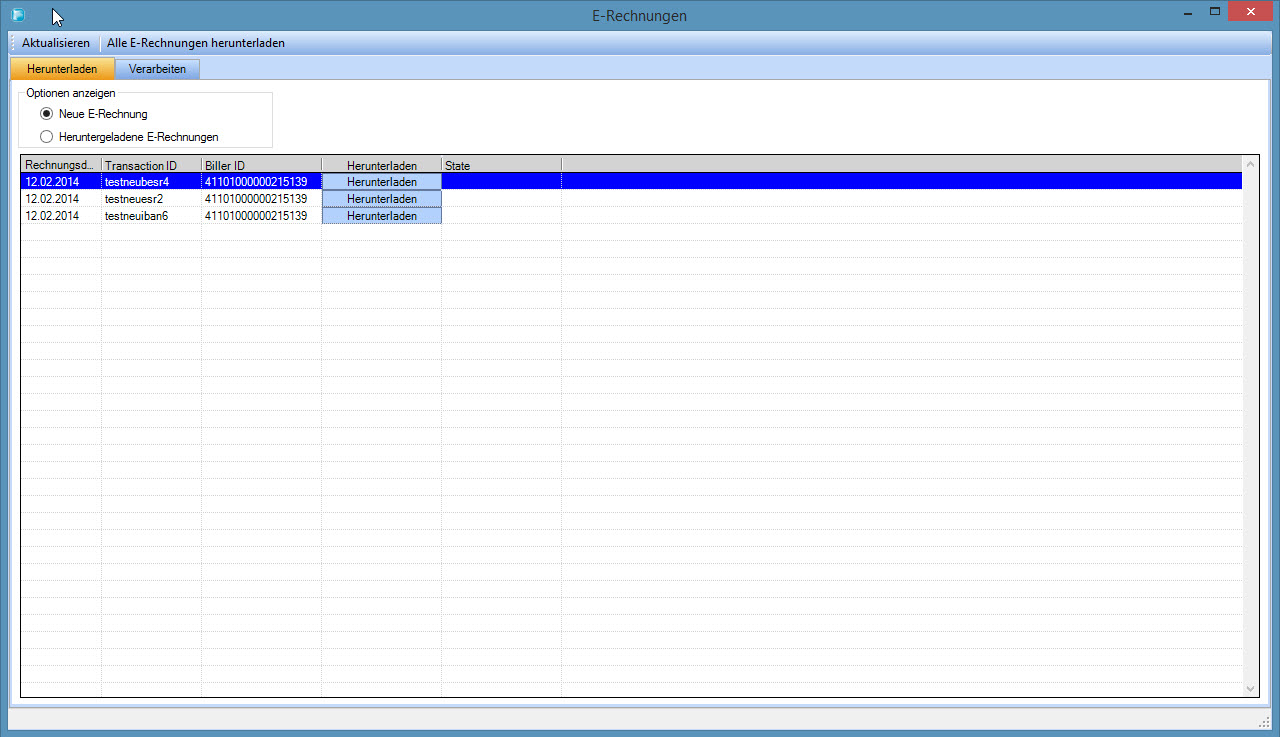 den bereits herunter geladenen E-Rechnungen zu wählen. Wählen Sie den Radiobutton [Neue E-Rechnungen], entsprechend werden im Grid die