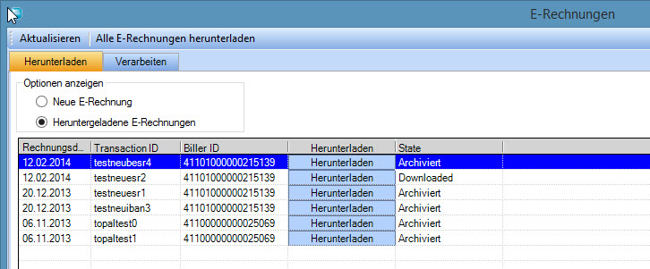 worden sind. Falls Sie dies wünschen können bereits heruntergeladene E-Rechnungen via "Herunterladen" Button nochmals bezogen werden. Werden bereits