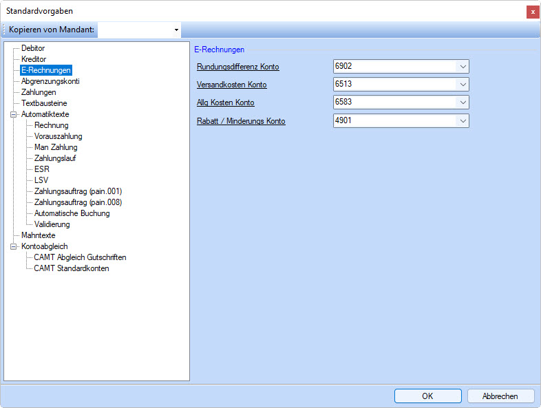 Definition von Standardkonten für die automatische Verbuchung von Rundungsdifferenzen, Versandkosten, allg. Kosten respektive