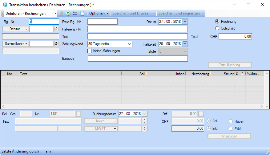 Mit diesem Befehl erstellen Sie die erste Buchung einer Debitorenrechnung, mit der Sie den Gesamtbetrag der Rechnung auf das Debitoren-Personenkonto buchen. Der Button wird aktiv, nachdem Sie eine Personenkontonummer und einen Betrag eingegeben haben, und kann mit ENTER ausgelöst werden.