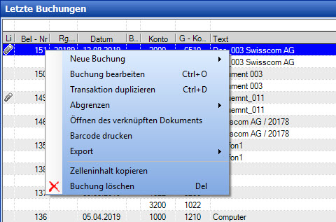 Im Hauptbuch Grid stehen Ihnen diverse Funktionen die Sie via Kontextmenü aufrufen zur Verfügung. Diese sind nachfolgend beschrieben.