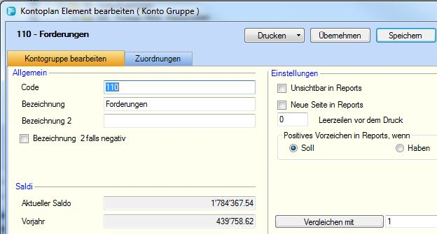 Mit dieser Funktion lassen sich beliebige Summen innerhalb des Kontenplans mit der aktuellen Gruppe vergleichen. Auf diese Weise können Sie z.B. feststellen, wieviel Prozent der Dienstleistungsertrag im Vergleich zum gesamten Ertrag aus Lieferungen und Leistungen ausmacht.