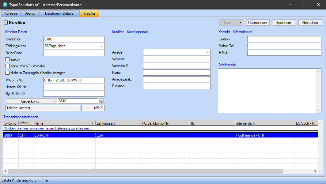 Indem Sie hier die Checkbox Kreditor aktivieren, werden weitere Felder eingeblendet, mit denen Sie das Kreditoren Personenkonto zu der aktuellen Adresse definieren können. Neben den