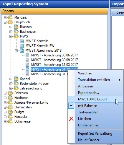 Ein MWST XML Export steht Ihnen im Reporting System wie auch im Hauptbuch zur Verfügung.