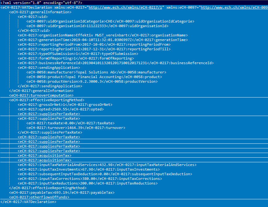 Im folgenen finden Sie einen Ausschnitt aus einem MWST XML Export.
