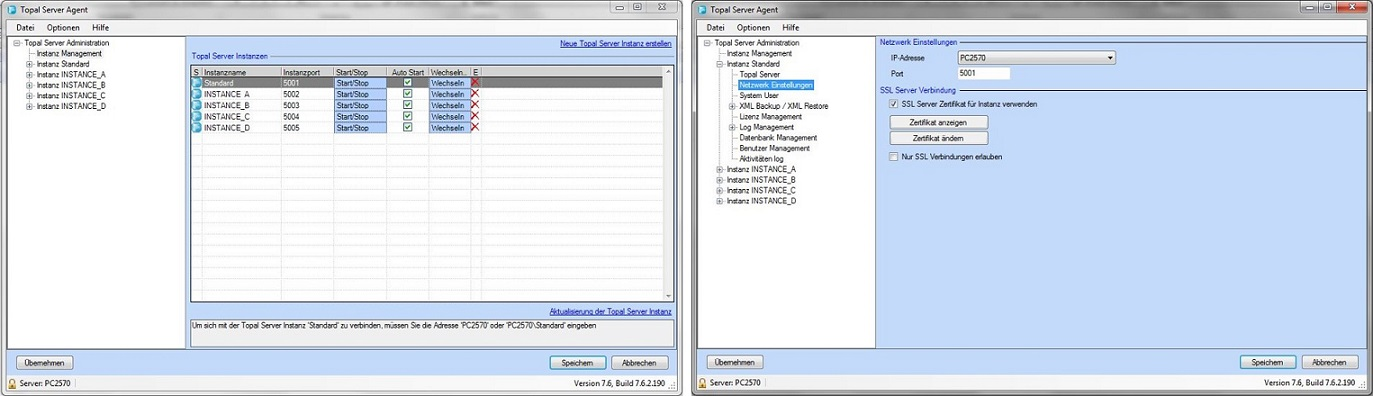 Die Installation des Server Zertifikats erfolgt via Server Agent. Wie bereits erwähnt erlaubt Topal die Erstellung mehrerer Instanzen. Entsprechend müssen bei der Verwendung von Zertifikaten pro Serverinstanz das entsprechende Zertifikat installiert werden. Folgen Sie den unten aufgeführten Schritten.