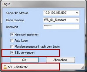 Mit der Aktivierung der SSL Checkbox erscheint ein neues Symbol (SSL Certificate) auf dem Login Dialog. Dieses Symbol ist als Button implementiert und dient dazu das Benutzerzertifikats zu importieren.