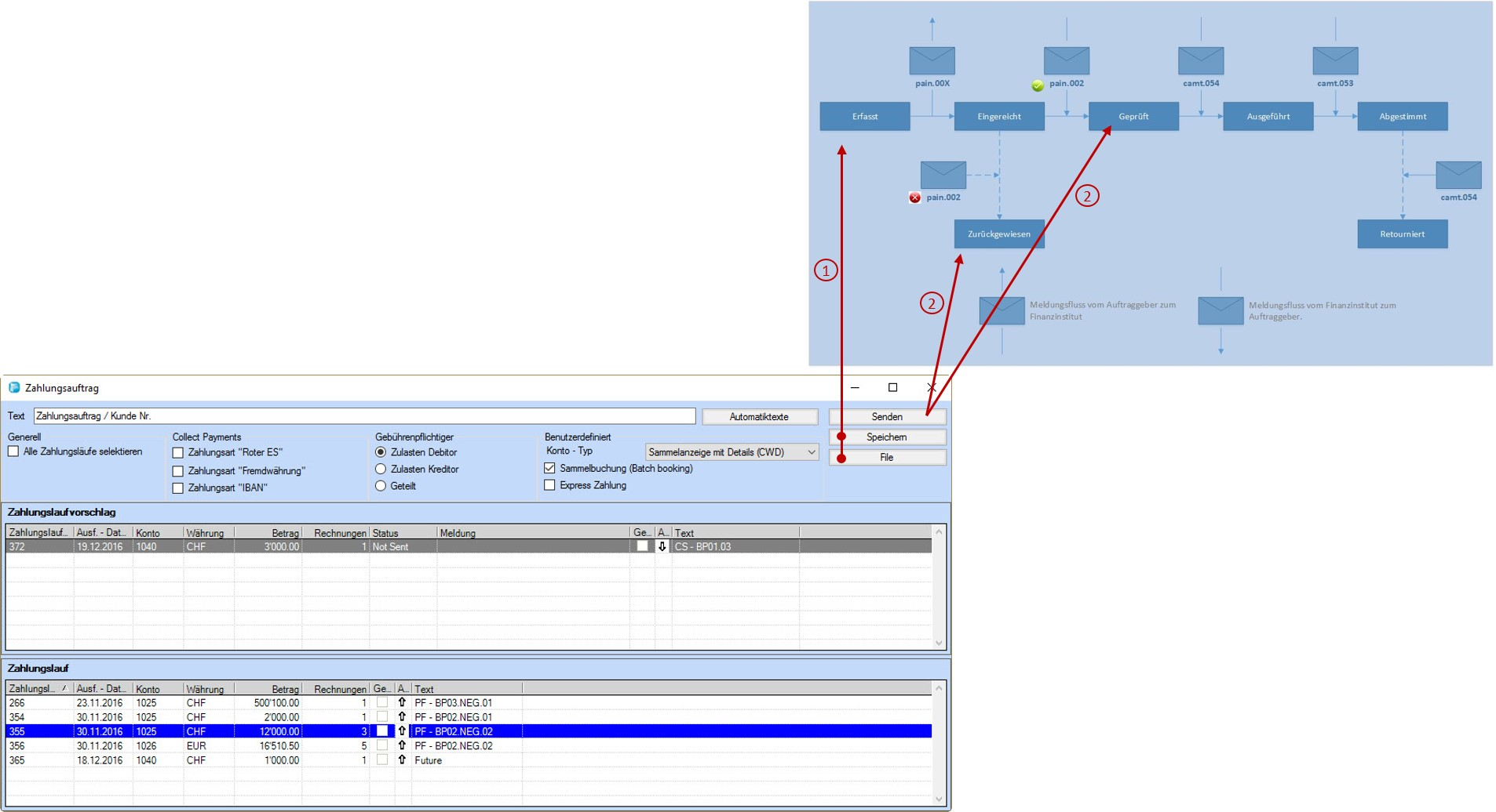 Mit dem Button [Senden] wird der Zahlungsauftrag an Ihre Bank oder Post zur Zahlung übermittelt. Der Auftrag ist danach im Status [Geprüft] oder [Zurückgewiesen].