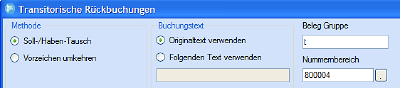 Das Fenster „Transitorische Rückbuchungen“ enthält folgende Einstellungen:
