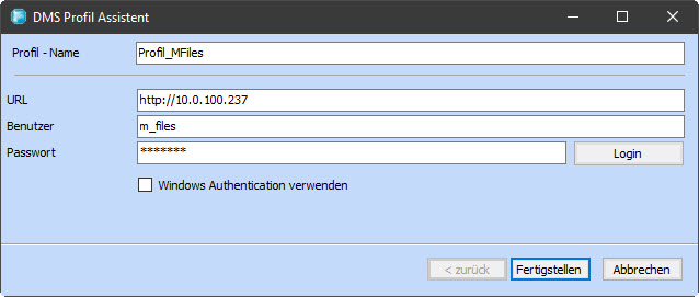 Verbindungsparameter Einstellungen für MFiles DMS Anbindung.