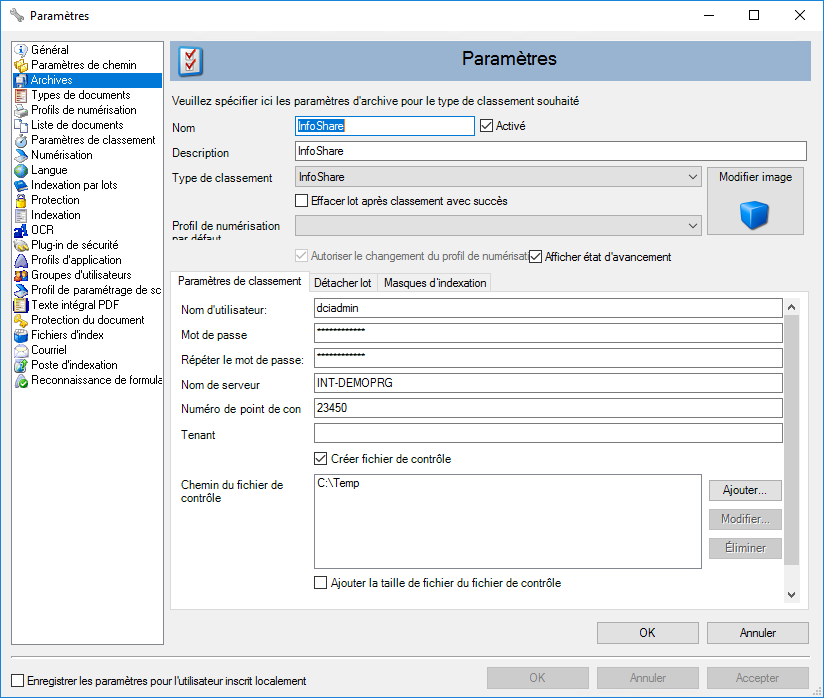 Avec la configuration du stockage, une relation entre Kendox Scan et InfoShare est créée.
