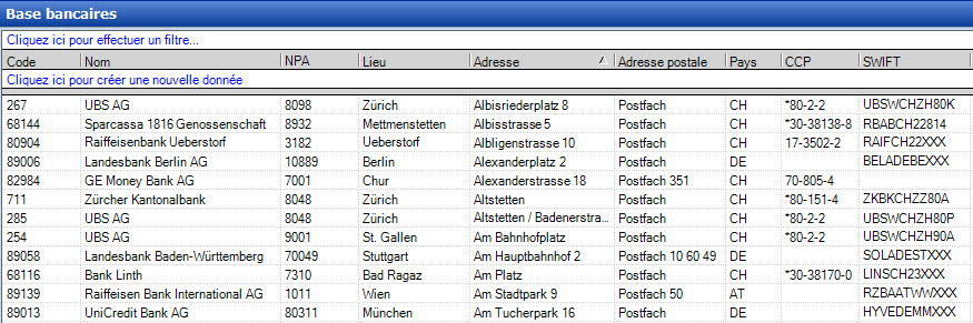 Topal contient l'ensemble des données bancaires suisses comme condition préalable au bon déroulement des opérations de paiement électronique. Ceci facilite la saisie de vos relations bancaires de vos clients/fournisseurs, enregistrés dans les méthodes de paiement, ainsi qu'à créer vos propres comptes bancaires.