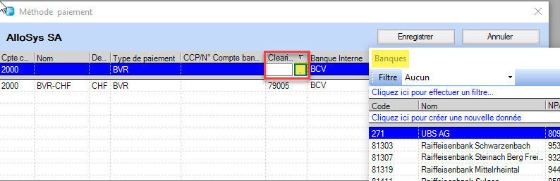 Partout dans Topal, où des relations bancaires doivent être saisies, l’accès à liste de la base bancaire se trouve dans la colonne Clearing. Positionnez-vous dans le champ Clearing et sélectionnez l’institut financier désiré (Figure 2).