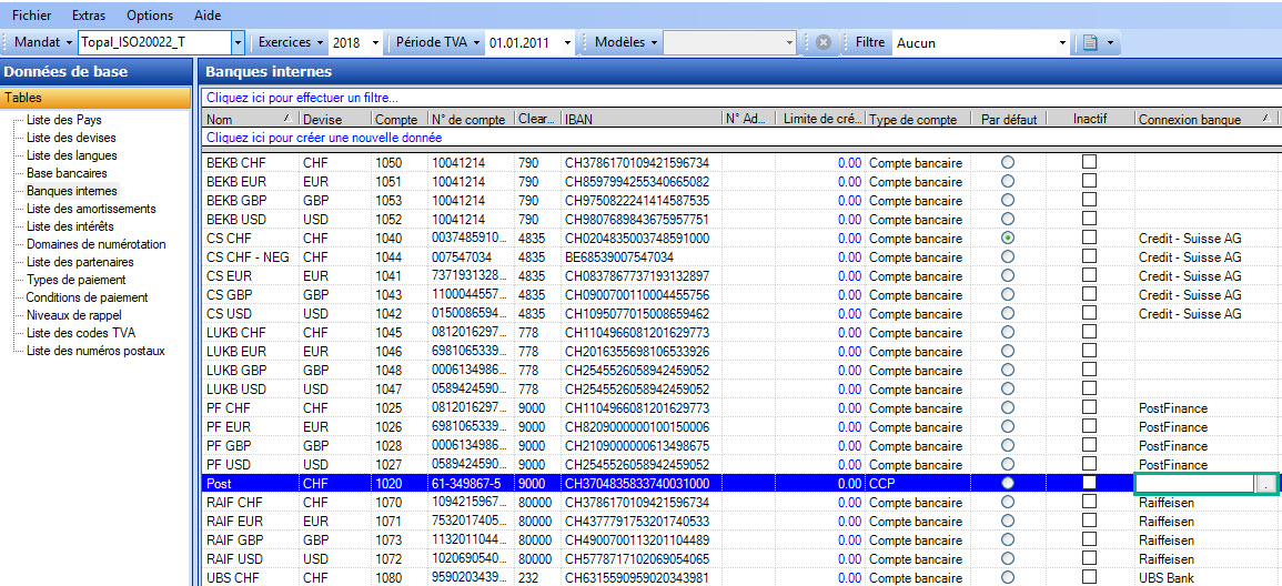 Les paramètres de connexion à votre banque sont configurés dans les données de base de vos comptes bancaires. Ouvrez la boîte de dialogue de saisie des paramètres de connexion bancaire via [Données de base > Banques internes]. Cliquez sur le champ Connexion banque pour ouvrir la boîte de dialogue des paramètres (voir Figure 1). Si la colonne Connexion banque n'est pas visible, ajoutez-la via le menu contextuel : [clic droit dans l’en-tête de colonne > Insérer une colonne].