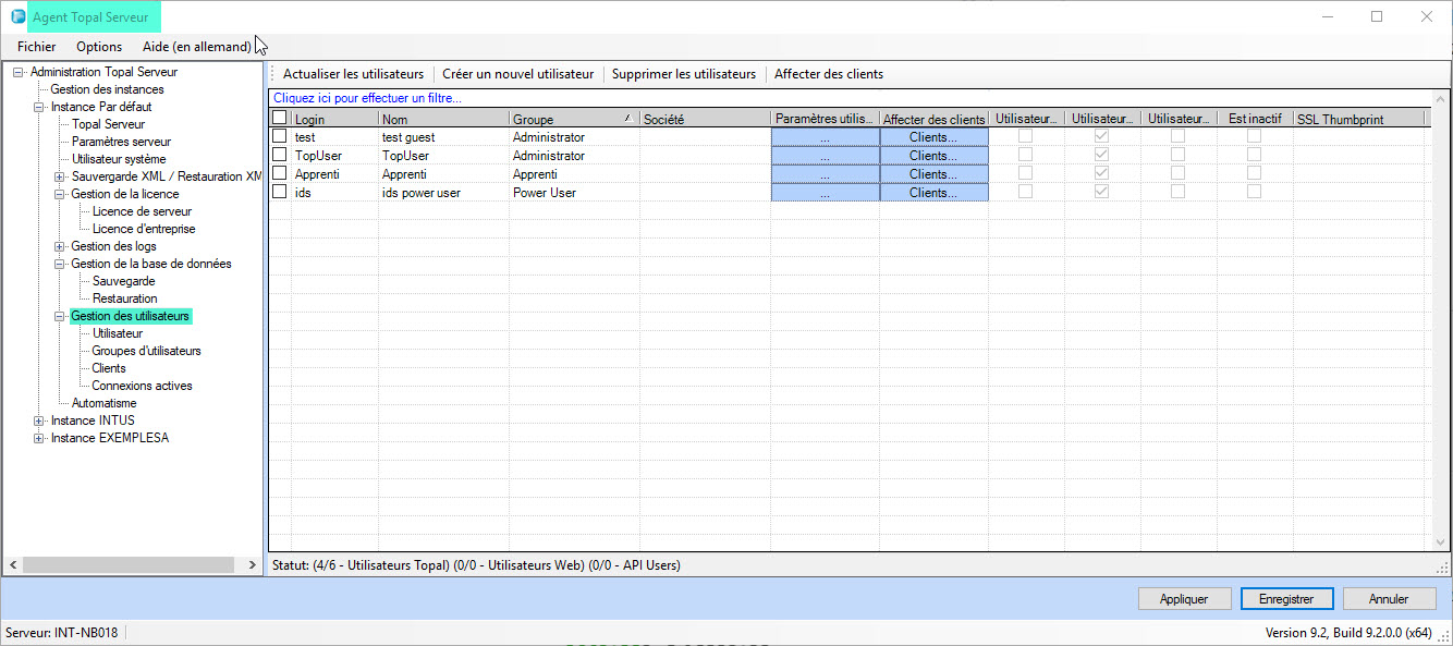 La gestion des utilisateurs peut être personnalisée via le Topal Client ou le Topal Server Agent. Pour personnaliser les autorisations utilisateur, vous devez disposer du droit d’administrateur. Les paramètres utilisateur du Topal Server Agent et le Topal Client sont équivalents. L’exception est que Topal Server Agent, offre une vue d’ensemble des connexions actives en plus.