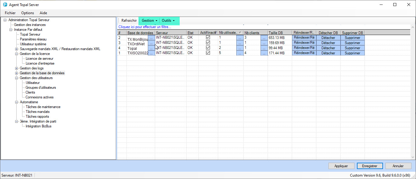 Pour supprimer une base de données, vous devez d'abord la désactiver via la case à cocher de la colonne Actif/inactif. Un clic sur le bouton Supprimer, efface la base de données définitivement, même du serveur SQL. La base de données est ensuite retirée du grid (gestion de la base de données).