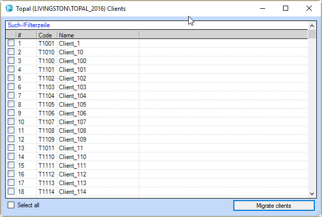 Les mandats répertoriés se trouvent dans la même base de données (partition). Ici, vous avez la possibilité de migrer un mandat vers une base de données individuelle ou vers un autre serveur SQL. Cochez les mandats que vous souhaitez migrer et confirmez avec le bouton [Migrate clients].