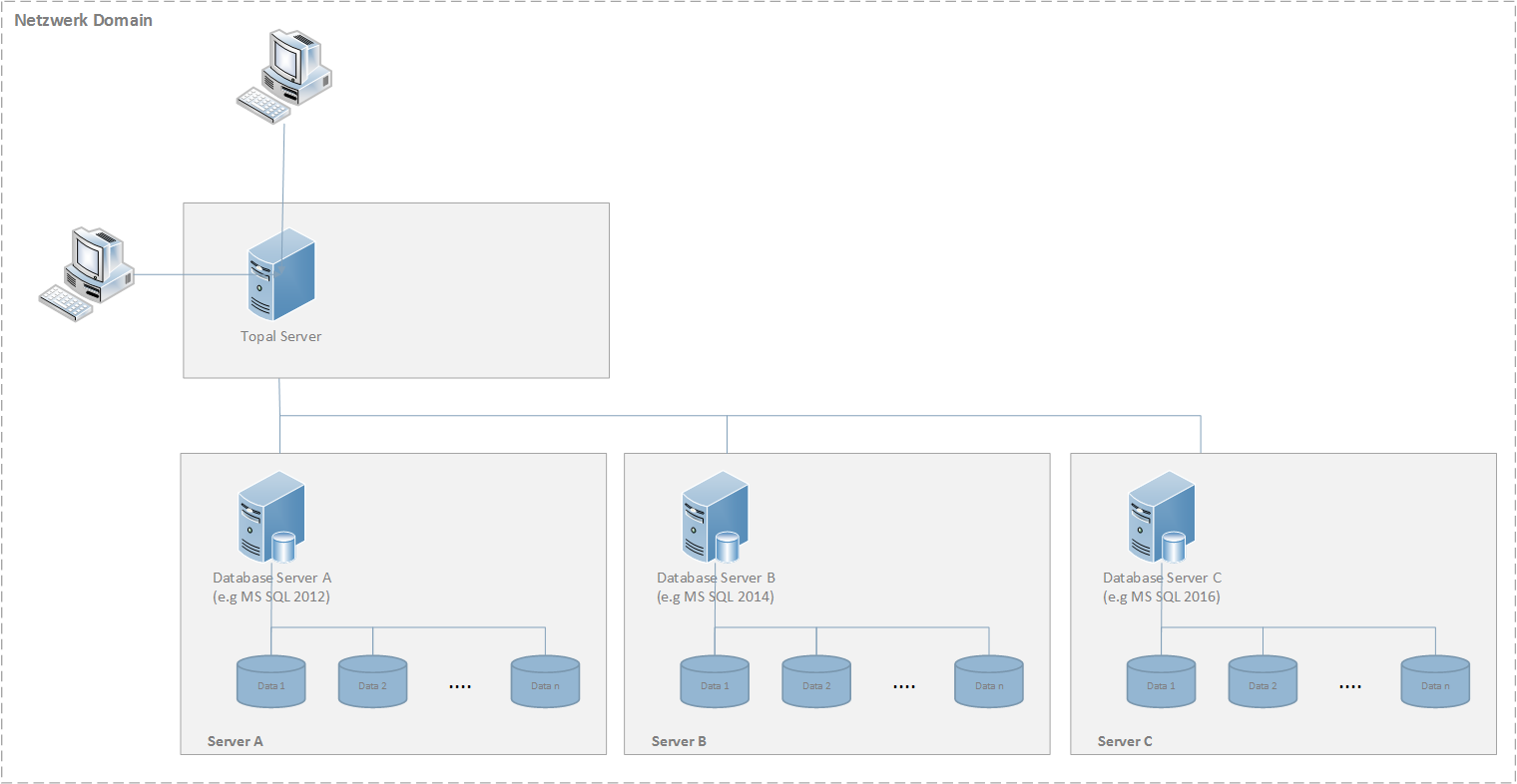 La gestion de la base de données du Topal Server Agent est utilisée pour administrer les serveurs de bases de données, les bases de données et leurs mandats. Topal vous permet d'utiliser plusieurs serveurs de bases de données. Ainsi, il est possible d'installer différents serveurs de base de données dans votre infrastructure et de les connecter à Topal. Vous trouverez une description détaillée des fonctions dans le chapitre Administration de la base de données.