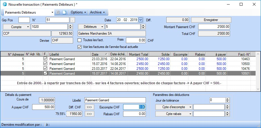 Cette fonction permet de traiter les paiements partiels. Si vous avez convenu avec un client qu’il peut payer en plusieurs fois, saisissez ici le montant reçu, à diminuer sur cette facture. Le poste ouvert d'origine n’est pas touché, il s'agit uniquement de saisir le montant partiel entré à la banque. Si plusieurs factures sont concernées par des diminutions (Figure 1), procédez ainsi: sélectionnez les factures dans la table et indiquez le montant reçu dans le champ Montant paiement CHF. Répartissez ce montant entre les factures dans les champs A payer. Le programme transfère le total des montants diminués ainsi sur les factures dans le champ Total CHF comme montant à comptabiliser.
