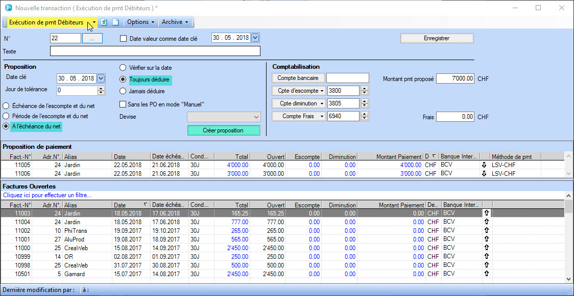 Les propositions de paiements des débiteurs sont utilisées pour encaisser les factures par prélèvement direct. Seules les factures définies dans les méthodes de paiement avec mode de paiement LSV-débit direct sont prises en compte. Enregistrez la relation bancaire du débiteur, avec lequel vous avez convenu d’un prélèvement automatique, avec la méthode de paiement LSV-DD dans les [Adresses/tiers].