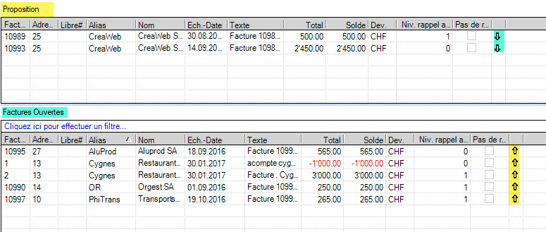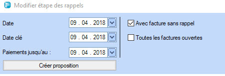 Si vous cliquez sur le bouton Créer proposition, toutes les factures qui dépassent la date clé sont chargées dans la proposition de rappel.