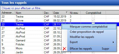 Dans les deux tables, vous pouvez voir le niveau de rappel des factures. Après avoir imprimé les rappels, executez la commande Marquer comme comptabilisé à l'aide du menu contextuel.