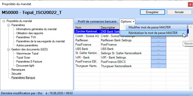 Le mot de passe MASTER se configure dans les propriétés du mandat. Ouvrez la boîte de dialogue via [Mandats > Propriétés] et sélectionnez le nœud [Paramètres Banque] dans l'arborescence. Les mêmes règles s'appliquent au "mot de passe Master" qu'aux mots de passe individuels des institutions financières.