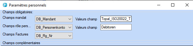 Le champ "Champ mandat - valeur champ" n'est pas obligatoire, mais il est étroitement lié au champ "Mandat". Si les noms des mandats diffèrent entre Topal et la GED, vous pouvez utiliser ce paramètre pour créer une relation entre le mandat Topal (p. ex. Topal_ISO20022) et le mandat GED (p. ex. Topal_ISO20022_T).