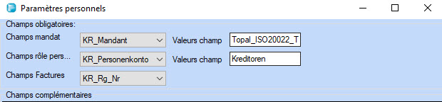 Le champ "Champ mandat - valeur champ" n'est pas obligatoire, mais il est étroitement lié au champ "Mandat". Si les noms des mandats diffèrent entre Topal et la GED, vous pouvez utiliser ce paramètre pour créer une relation entre le mandat Topal (p. ex. Topal_ISO20022) et le mandat GED (p. ex. Topal_ISO20022_T).